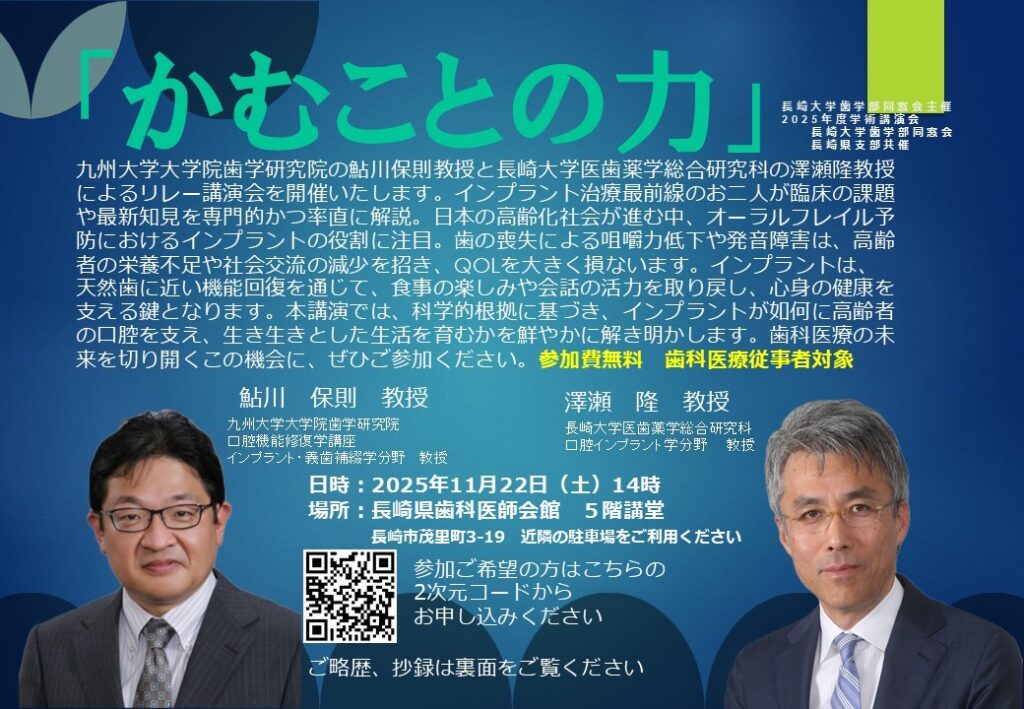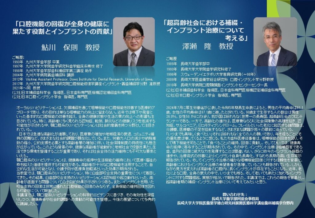 九州大学大学院歯学研究院の鮎川保則教授(九州大学歯学部卒)と、長崎大学大学院医歯薬学総合研究科の澤瀬隆教授による特別講演会が開催されます。